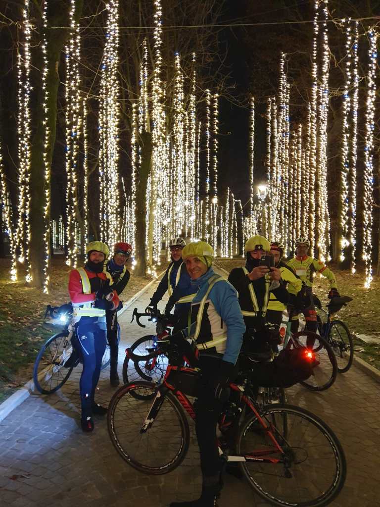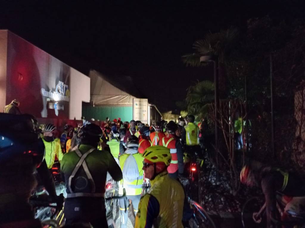 I primi dieci chilometri sono un calvario. La tosse non mi lascia tregua e le gambe sembrano proprio non voler girare, ma il contesto che mi circonda, mi ripaga di ogni fatica. La prima parte del percorso, infatti, si svolge tutta all’interno di una bellissima ciclovia che si snoda stretta e sinuosa in mezzo alla natura. Oltre centosessanta ciclisti ormai sgranati in piccoli gruppetti, con le loro luci e i loro giubbotti catarifrangenti, danno vita a una lunga processione a pedali che illumina la notte sotto un cielo pieno di stelle. Intorno a noi, un silenzio irreale in cui si può udire solo il fruscio delle nostre ruote e lo stridere sordo dei freni in concomitanza delle curve più insidiose.