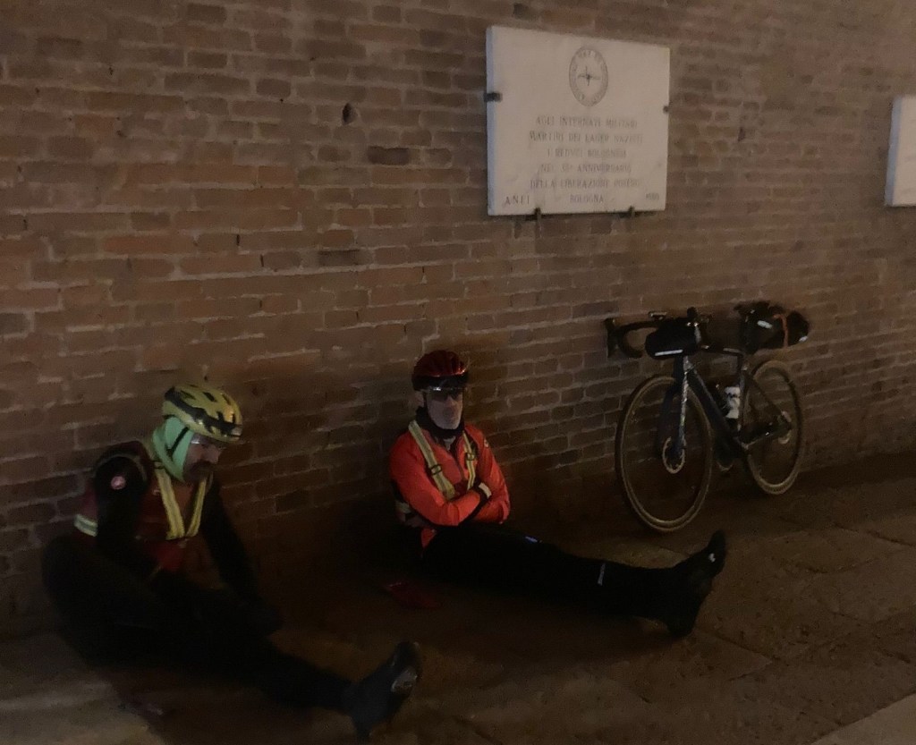 Sul percorso, fino a Imola, c’è poco da raccontare: l’infinita e noiosa (per il ciclista) pianura, oltre 300 chilometri, quasi tutti di via Emilia. Ciò che ricorderò sempre è invece la bellezza delle città di notte, raggiungerle in bici, col buio, attraversarle lentamente e sdraiarsi a riposare nella piazza centrale. Questo mi è mancato alla Parigi Brest Parigi: il percorso francese è quasi sempre in mezzo al nulla. Poter scegliere la traccia in autonomia è il valore aggiunto delle Fléche, a mio parere, perché permette di costruire l’itinerario per adattarlo alla propria idea di ciclismo, alle proprie esigenze.