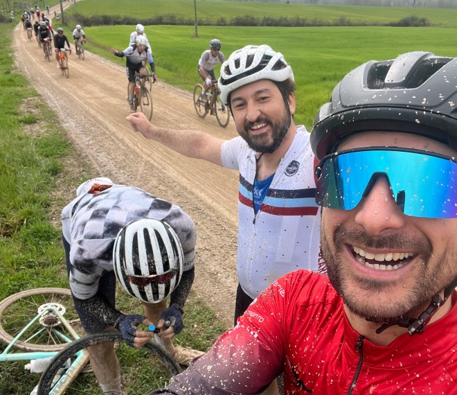 Arrivano i primi settori di sterrato e la situazione si fa ancora più complicata. Il terreno è pregno di fango e siamo in tantissimi, decisamente troppi, gomito a gomito lungo tratti di strada stretta e tortuosa. Sto pedalando in uno dei paesaggi più belli che conosca, su un terreno sconnesso che mi ha sempre divertito e dato grandi soddisfazioni, eppure la sensazione è quella di essere nel traffico di Milano. Vorrei accelerare, ma c’è sempre qualcuno piantato davanti. E da dietro continuo a sentire urlare: «Destra!», «Sinistra!» da parte di altri concorrenti che sgomitano per cercare di guadagnare qualche posizione. Un vero e proprio purgatorio a pedali, ma tengo duro. Testa bassa e pedalare, come tutti quelle intorno a me. Dopotutto, l’allenamento fatto nelle settimane precedenti sta dando i suoi frutti e la media dopo 50 km è di tutto rispetto.