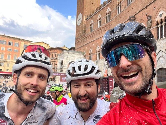 Poi l’arrivo ai piedi del muro di Santa Caterina, stremato e coperto di fango. In lontananza si percepisce distintamente l’urlo della gente che incita noi granfondisti delle retrovie, arrivati fin qui senza energie ma con la sola forza della volontà. E in mezzo a quel rumore vedo in lontananza K che dà il cinque a sua figlia e alla sua compagna, ferme a bordo strada ad aspettarlo. Una fotografia che mi rimarrà impressa nella mente e che dà alle mie gambe quel briciolo di energia necessario per alzarmi sui pedali. Un ultimo scatto e poi lasciare finalmente esplodere tutto nella splendida cornice di Piazza del Campo, abbracciando i miei compagni di avventura, K e Francesco, ritrovati quasi per caso ai piedi dell’ultima salita, dopo aver pedalato per tutta la giornata praticamente da solo. Ecco, solo questi cinque minuti finali valgono il prezzo del biglietto. E mi riconciliano con una giornata molto strana. Una giornata in cui per 130 chilometri ho convissuto con una sensazione di estraneità che, in uno sport come la bicicletta, non dovrebbe esistere.